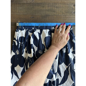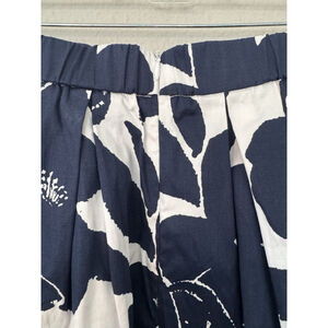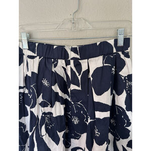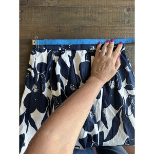 This women's floral blue-white A-line skirt features a zipper closure and elastic waist for a comfortable fit. The knee-length skirt is versatile for various occasions, including parties, casual outings, formal events, and business meetings. It is machine washable and comes with pockets for added convenience. The skirt is in size M and is suitable for all seasons, making it a stylish and practical addition to any woman's wardrobe.