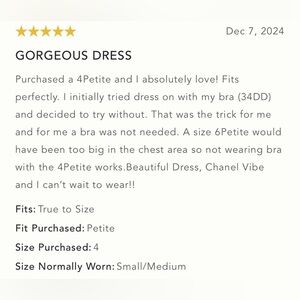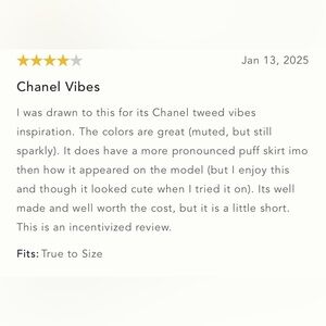 I was drawn to this for its Chanel tweed vibes inspiration. The colors are great (muted, but still sparkly). It does have a more pronounced puff skirt imo then how it appeared on the model (but I enjoy this and though it looked cute when I tried it on). Its well made and well worth the cost,