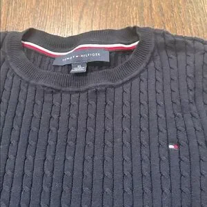 Classic navy crewneck sweater. Cable knit design. Iconic Tommy Hilfiger