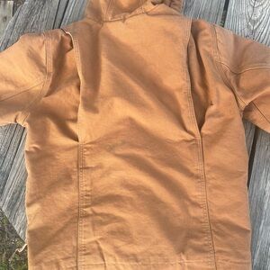 Sturdy Carhartt utility jacket with hood. Features front zipper and multiple pockets. Size Large Loose fit. Very faint marks on the back of the jacket, as shown in last three pictures. Style: OJ4392-W