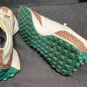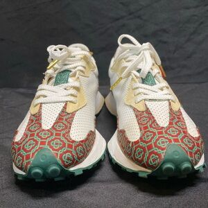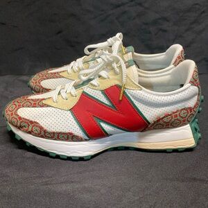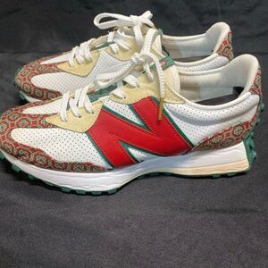 Stylish New Balance sneakers with bold red accents. White perforated upper for breathability. Unique patterned design adds flair.