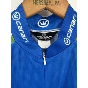 The Canari Cycling Jersey in men's size large features a 1/2 zip closure, mock neck neckline, and stand-up collar. Made from a knit fabric, this activewear piece is suitable for cycling with its classic fit and short sleeves. The Seattle-themed jersey in blue, green, and white colors includes pockets and a graphic print pattern, perfect for a casual or sports-inspired look. Machine washable and with a chest size of 48 inches, this jersey is ideal for cyclists looking for style and comfort on their rides.