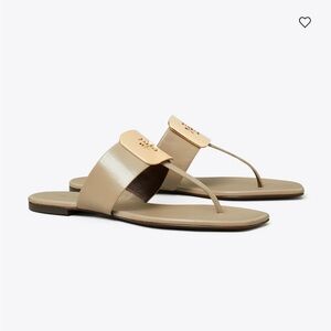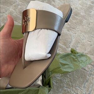 Elegant taupe slide sandals by Tory Burch. Features a striking gold emblem.