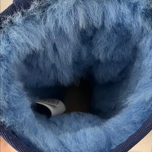 Never worn. Classic short boot. Excellent condition. Vibrant blue boots with stylish striped details. Warm shearling interior.