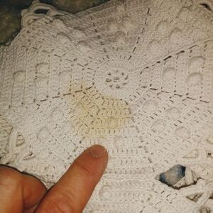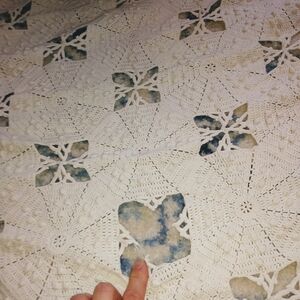 Crocheted Doilie Duvet Afghan Queen Size Blanket Throw. Condition is "Used". Shipped with USPS Priority Mail. Dimensions 107" x 88" there are a few flaws as shown in photos, 2 stains & 1 rip. Very heavy well made blanket.