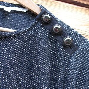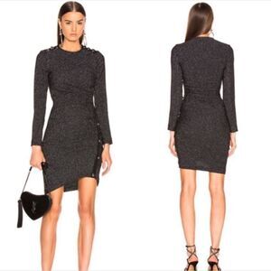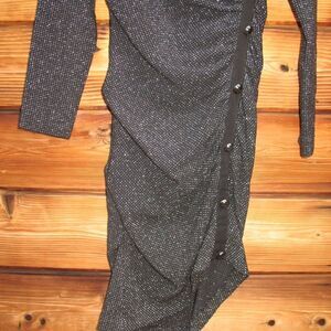 Long sleeve, button details at the shoulders, and one side of the dress. Crew neck, ruched details. fitted style.