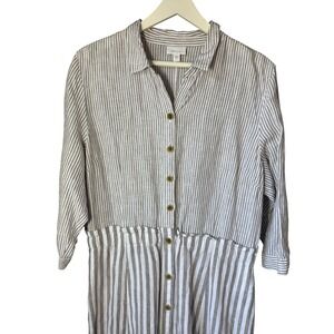 Keywords: JJill, linen dress, striped dress, button front, midi dress, shirt dress, drawstring waist, 3/4 sleeve, collared dress, casual dress, resort wear, lightweight, breathable, summer dress