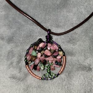 Tourmaline Tree Of Life pendant on an adjustable leather lace necklace. Handmade item.