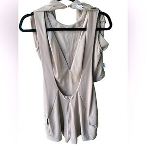 Chic pale pink shorts romper with short sleeve crop top that is not removeable . Open back with few v-plunge. Cargo short style with flip-over-flaps pockets and zipper/hook-and-eye closure on the back.