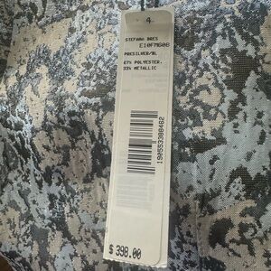 This elegant Elie Tahari dress features a sophisticated metallic silver, baby blue and cream design, perfect for cocktail events. The sleeveless sheath style with a crew neck and flutter sleeves offers a chic and modern silhouette. Its shimmering pattern and midi length make it an ideal choice for wedding guests or formal occasions. It is NWT and a size 4. Show stopping dress!