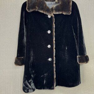 This vintage black coat features luxurious faux fur with a brown trim, providing both warmth and style. Its classic button closure and elegant design make it a timeless addition to any wardrobe.