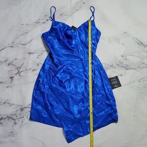 LuLus Blue Satin Cowl Neck Faux Wrap Mini Dress