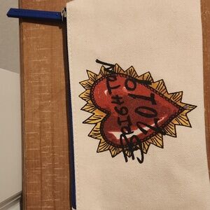 Colorful canvas pouch featuring a heart and bird design. Includes vibrant blue and red accents.