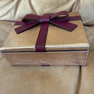 This elegant handbag features a stunning gold exterior with a chic burgundy bow accent. Perfect for adding a touch of sophistication to any outfit. Whimsical and perfect for the holiday season.