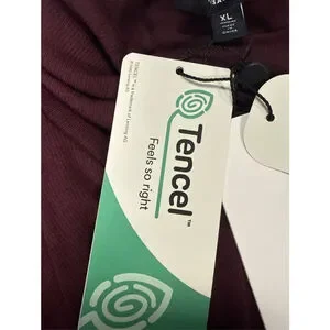 This is a new with tags Universal Standard women's turtleneck sweater in a rich burgundy color, size XL. The garment features long sleeves with ribbed cuffs and a relaxed fit. The fabric appears to be a soft, stretchy knit, possibly Tencel Modal as indicated by the hang tags, which also highlight eco-soft technology and breathability. The turtleneck collar is a classic fold-over style. No visible imperfections or signs of wear are present.