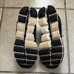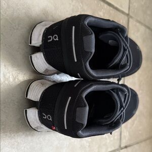 Stylish black athletic shoes with white soles. Perfect for running. Comfortable and lightweight.