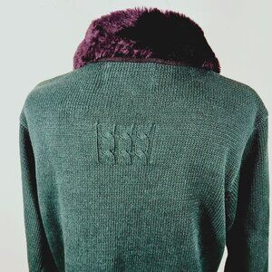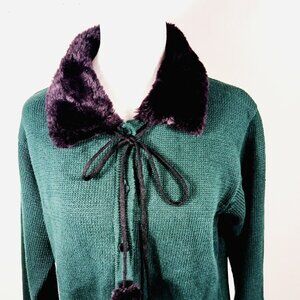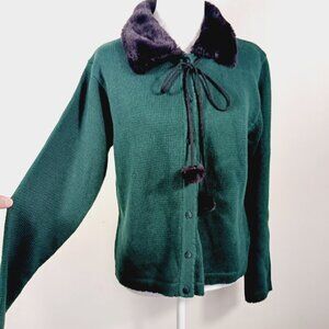Vintage Marisa Christina Drk Green Cardigan Faux Fur Collar W Pom Christmas 2001
