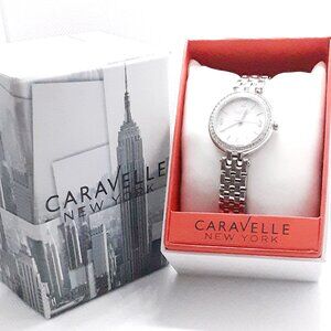 New big, bold and beautiful statement piece of jewelry. Ladies Caravelle New York series by Bulova watch, crystal bezel, white face with sweep second hand, markers at 12, 3, 6 and 9, stainless steel bracelet link band with dress deployment clasp. Band measures 12 mm wide and 6 inches in length. Length does not include the deployment clasp. Fits any standard wrist size 7 to 7 1/4. Up to 5 links can be removed to size down the band to your wrist size. A beautiful classic bold piece of jewelry to wear on your wrist that makes a statement your style is a step ahead. The crystals around the bezel make this watch an accessory for a special evening out that catches the light when you move your wrist. The watch design screams classy and is waiting for just the right person to help it show off its glam. Comes packaged on a pillow cushion in a designer box, instructions included.