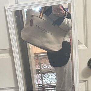 Stylish Coach tote in cream with tan and brown details. Perfect for everyday use. Features signature Coach logo.