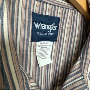 Keywords: Wrangler, button-up, long sleeve, Brown, striped, casual, Vintage, western, 2XL, men's shirt, fall fashion, collared, snap closure, dual chest pockets, machine washable.
