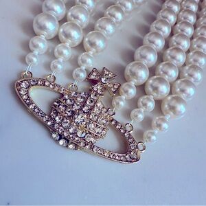 This stunning pearl necklace features an elegant crystal orb/cross pendant, perfect for adding a touch of sophistication to any outfit. Ideal for special occasions or everyday elegance.