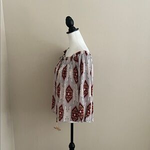 Chic off-shoulder blouse with a striking cream and red pattern. Perfect for casual wear.