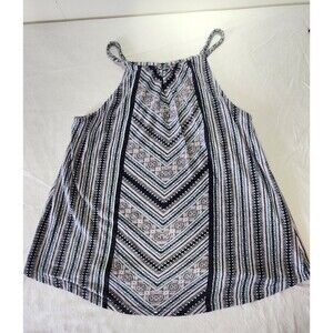This Lucky Brand Live In Love womens halter top in size Medium features a boho-inspired chevron and stripe print with soft blue, black, and cream tones. The front includes a beautifully woven macramé-style triangle detail, and the braided halter straps add to the relaxed, summery look. Lightweight and flowyperfect for casual wear, festivals, vacations, or warm-weather layering.