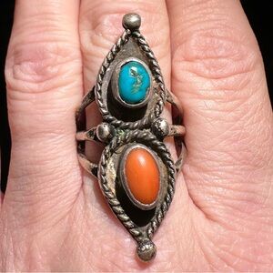 Navajo Vintage Sterling and Turquoise and Coral Ring 10