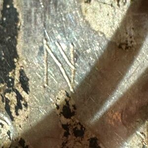 Has an etching from the maker looks like an N where the Second, to the right vertical line is also a Y. I am going to be researching the maker. This is very old. I cannot date it. It is definitely vintage at least, but it is more likely to be an antique, I cannot prove this, though I don’t have any way of dating the stones or the silver. If I can find out the maker, I will be able to tell you if it’s over 100 years old, but it’s very hard to connect. Makers marks to silversmiths in the Navajo and other Native American cultures