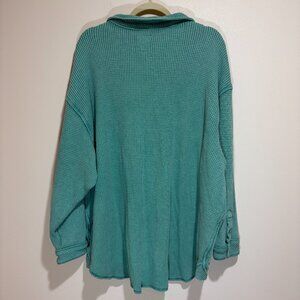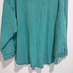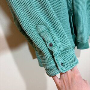 Aerie Lumber Jane Waffle Thermal Button Up Shirt. Long sleeve. Collared. Flap chest pockets. Teal blue color.