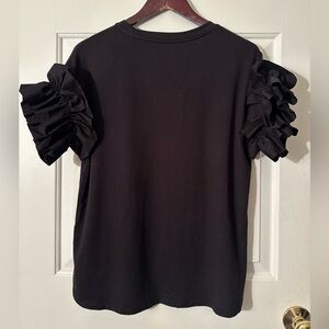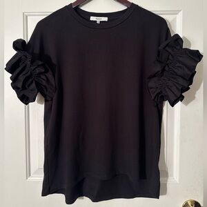 RO & DE XS Black SOFT Stretchy Crew Neck Ruffled Sleeve Smile Hem Hi Lo MADE USA