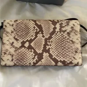 Elegant Coach bag with a striking snakeskin design. Features cream and brown tones. Eight card slots, full bill compartment & inside zip pocket. Leather crossbody with Detachable strap to make a clutch