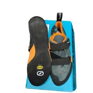 Dynamic climbing shoes with a black and gray base. Bright orange accents for style. Ideal for climbers.