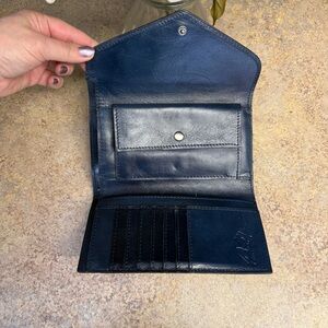 Trifold envelope wallet with adjustable snap closure. Preowned, in prefect condition. No wear, rubs or marks.