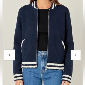 English Factory-Chic navy knit bomber jacket. Features white striped collar. Ideal for casual wear.