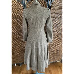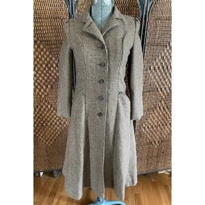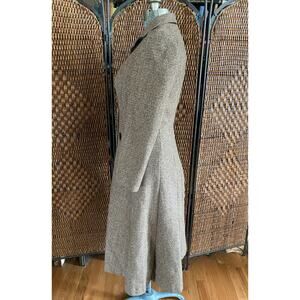Beautiful coat tailored to accentuate curves. Brown tweed wool. Structured pockets at hips. Buttons up front. Collars. Coat she’ll is in excellent condition. Lining has some small bits of damage, but no major rips or tears that would impact wearability.