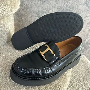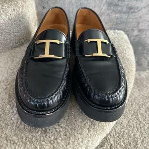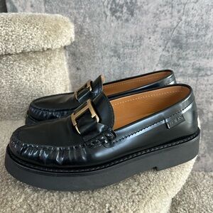 Elegant black leather loafers featuring a stylish gold Timeless accent. Perfect for any formal or casual occasion.