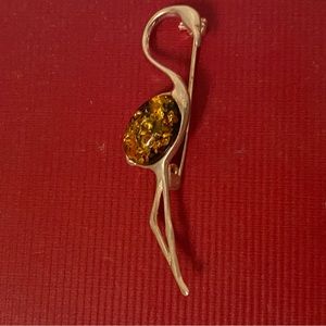 BROOCH PIN FLAMINGO BIRD STERLING SILVER 925 AMBER YELLOW STONE