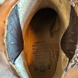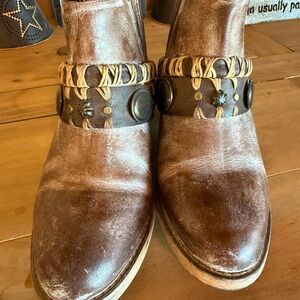 Stylish western brown ankle boots. Features decorative strap with metal accents. Perfect for casual wear.