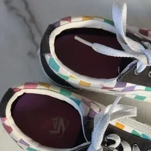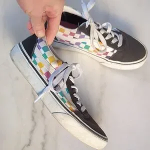 Stylish sneakers with a multicolor checkered pattern. Features black and white accents.