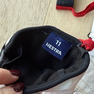 Durable Hestra gloves featuring black and white design with gold branding. Ideal for outdoor activities. See pics. Good condition