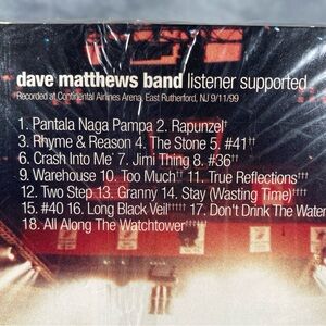 Immerse yourself in the energetic performances of the Dave Matthews Band with this Listener Supported VHS from 1999. Featuring fan-favourite hits such as "Crash Into Me" and "Too Much," this tape captures the essence of the band's dynamic stage presence and the timeless energy of their music.
