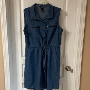 Stylish sleeveless denim dress featuring a drawstring waist and zippered chest pockets. Perfect for casual outings.