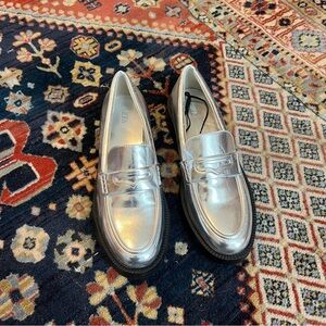 Sleek metallic loafers with a modern design. Comfortable and stylish for any outfit.