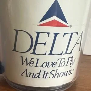 Delta Airlines mug with bold blue rim and handle. Features iconic Delta logo and slogan on both sides of the cup. Insulated plastic. Made by Eagle. From the 70’s. Very clean.