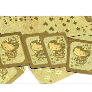 The product is a full deck of 52 Hello Kitty playing cards, featuring a collectible gold design. The cards are themed around art and are modern, manufactured in the current era. With the iconic Hello Kitty brand, this deck offers a fun and unique twist on traditional playing cards, making it a must-have for collectors and fans of the popular character. This deck would make a great addition to any Hello Kitty memorabilia collection or a fun gift for fans of the brand.