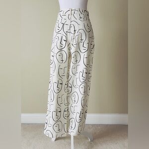 Shekou "Little Things" white denim jeans with a black abstract face print. Elevate your style with these artistic wide leg pants featuring a unique face pattern. Perfect for adding a creative touch to your wardrobe