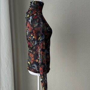 Cinq à Sept sheer mesh mock neck top in a multicolor floral print. Lightweight and stretchy with a fitted silhouette. Back keyhole with covered button closure. Long sleeves and soft mesh fabric. Perfect for layering, date night, or styling under jackets.