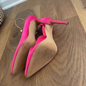Lemon Drop by Privileged Kira Bracelet Fuchsia Satin Stiletto Heels. The bracelet wraps around the ankle and it is gold tone with a ball on one side and a pearl on the other. very gently preowned. D’orsay style with a 4.5 inch heel. $140 retail.