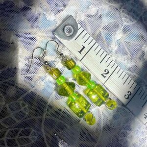 Beautiful Spring Green Art Glass beads in a variety of shapes make up these chunky Statement earrings. Square, cube, bi-cone, round and doughnuts at the bottom. Dangles with an approximate 2.5” drop - please see all pics for best idea of size.